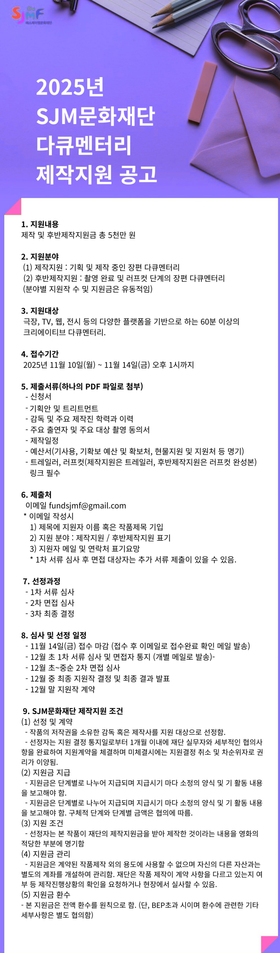 - 이전글 | 2025 SJM문화재단 다큐멘터리 제작지원 공모결과 2025.12.08
